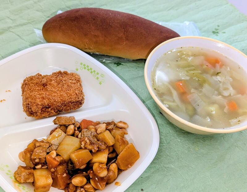 12月10日(水) 投稿日時 : 12/10 学校管理者 黒糖パン、野菜スープ、、ポークビーンズ(町産食材はじゃがいも)、えびカツ(667kcal) 0 {{options.likeCount}} {{options.likeCount}}