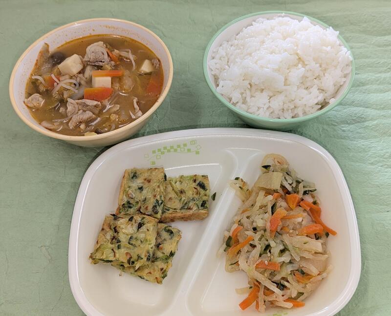 ごはん、豆腐チゲ、小さなねぎ焼き、大根ナムル(538kcal)