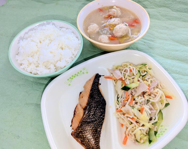 ごはん、みそちゃんこ汁、鮭の白醤油焼き、ゴマドレラーメンサラダ