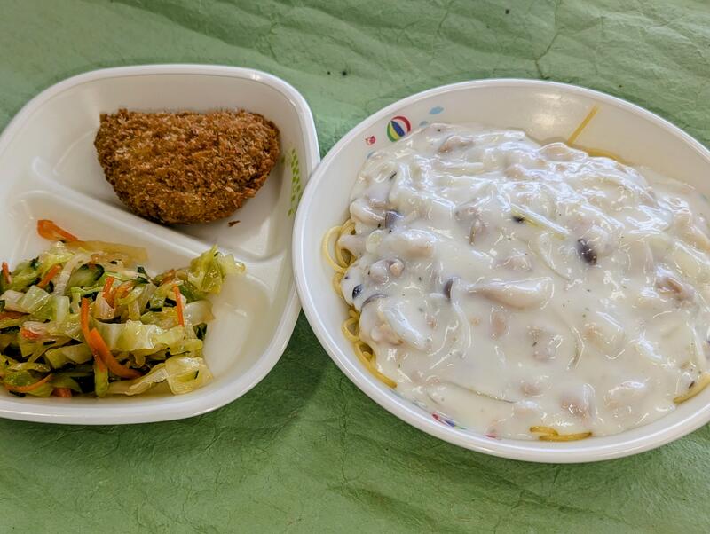 12月15日(月) 投稿日時 : 12/15 学校管理者 クリームスパゲティ、かぼちゃのひき肉フライ、和風サラダ(660kcal) 0 {{options.likeCount}} {{options.likeCount}}