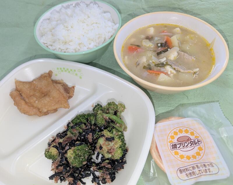 ごはん、豚汁(町産食材はじゃがいも)、若鶏のレモンソースがけ、ブロッコリーのおかかのり和え、焼きプリンタルト(763kcal)