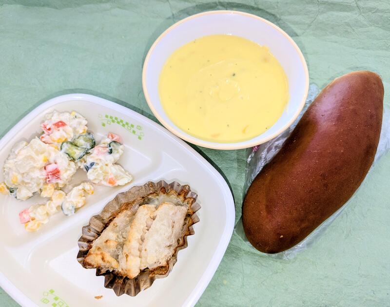 ごはん、豆腐の味噌汁、肉じゃが(町産食材はじゃがいも)、かにシューマイ(616kcal)
