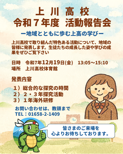 上川高校の行事 全ての記事 全ての記事 アーカイブ 2025年12月 (0) 2025年11月 (1) 2025年10月 (3) 2025年9月 (0) 2025年8月 (0) 2025年7月 (3) 2025年6月 (1) 2025年5月 (1) 2025年4月 (2) 2025年3月 (1) 2025年2月 (2) 2025年1月 (3) 2024年12月 (1) 2024年11月 (1) 2024年10月 (0) 2024年9月 (1) 2024年8月 (1) 2024年7月 (2) 2024年6月 (2) 1件 1件 5件 10件 20件 50件 100件 活動報告会を開催します 投稿日時 : 11/27 学校管理者 観覧希望の方は、下記のリンクから参加申込みして下さい。 参加申込みはこちら {{options.likeCount}} {{options.likeCount}} 123456789 »